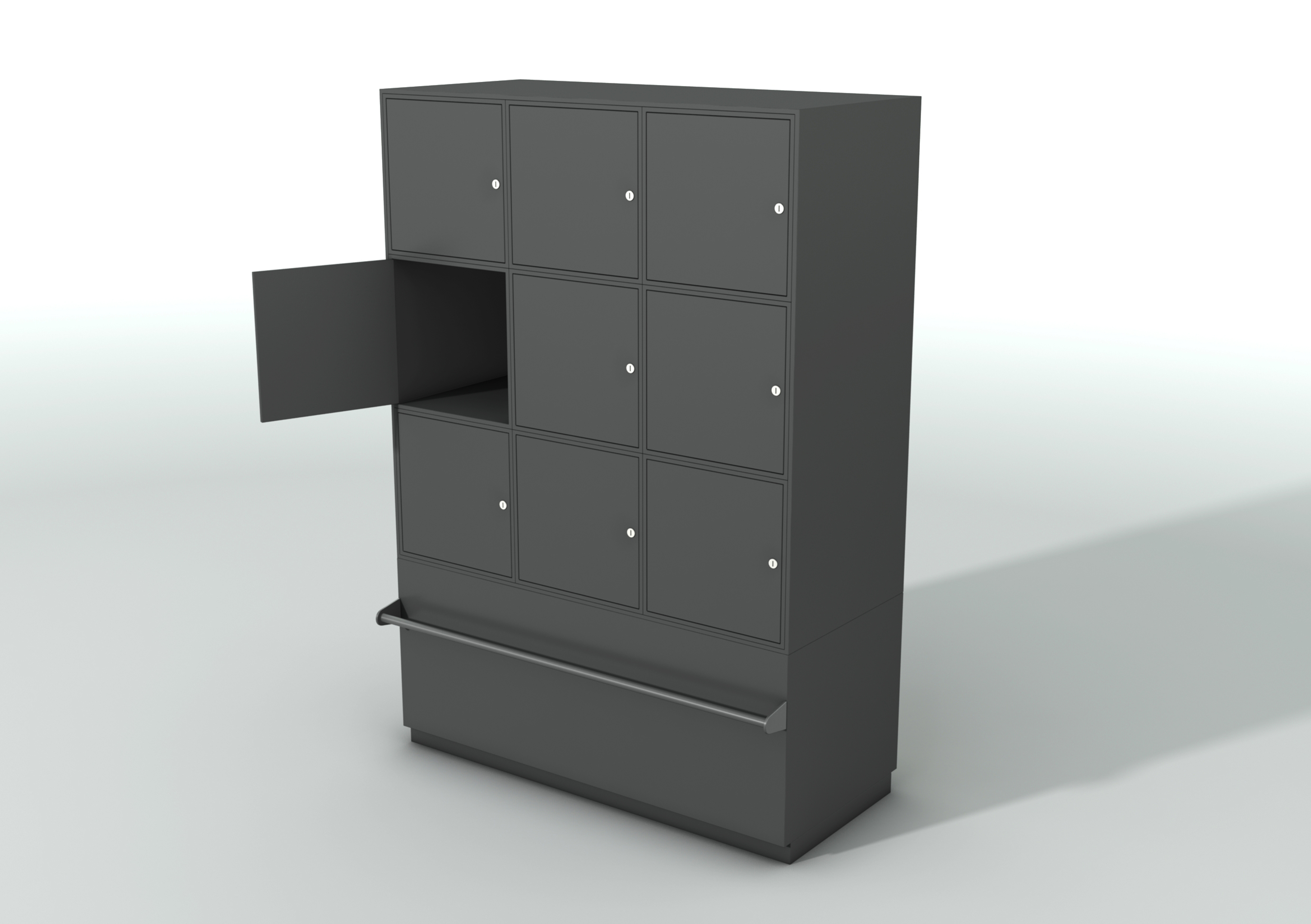 Unsere Schließfächer sind so bemessen, dass jeweils ein Helm und eine Tasche oder ein Rucksack darin Platz finden und sind in beide Richtungen im Überdachungsmodul montierbar. Optional sind die Schließfächer auch mit einer Steckdose für Ladezwecke (Ebike, Laptop und Handy) und einer Kühlfunktion ausrüstbar. Ein Bezahl- und Schließsystem wird nach Absprache integriert.